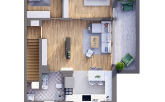 - układ pomieszczeń: salon z jadalnią (28,40), aneks kuchenny (10,36), 2 sypialnie (11,47 i 15,74), łazienka z WC (6,99), wiatrołap z klatką schodową (8,37)